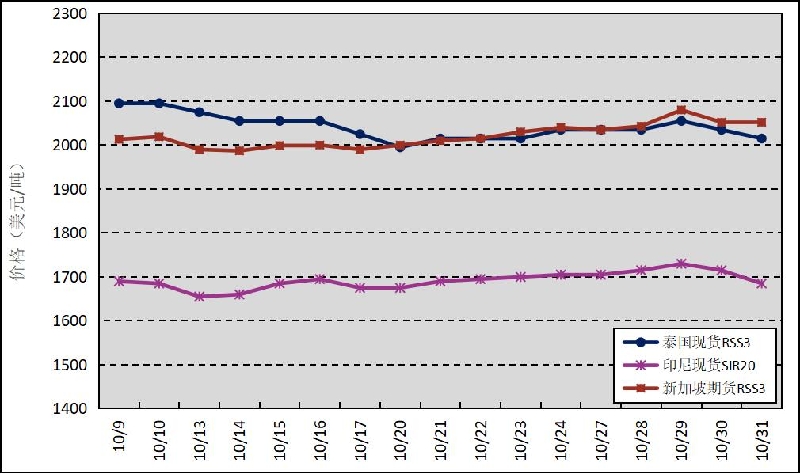 國外主產(chǎn)區(qū):9月,泰國現(xiàn)貨RSS3平均價格為2041美元/噸,環(huán)比下跌105美元/噸,最高價為2095美元/噸、最低價為1995美元/噸;印尼現(xiàn)貨SIR20平均價格為1692美元/噸,環(huán)比下跌20美元/噸,最高價為1730美元/噸、最低價為1655美元/噸;新加坡RSS3期貨主力合約月均結(jié)算價格為2021美元/噸,環(huán)比下跌110美元/噸,最高價為2080美元/噸、最低價為1987美元/噸。